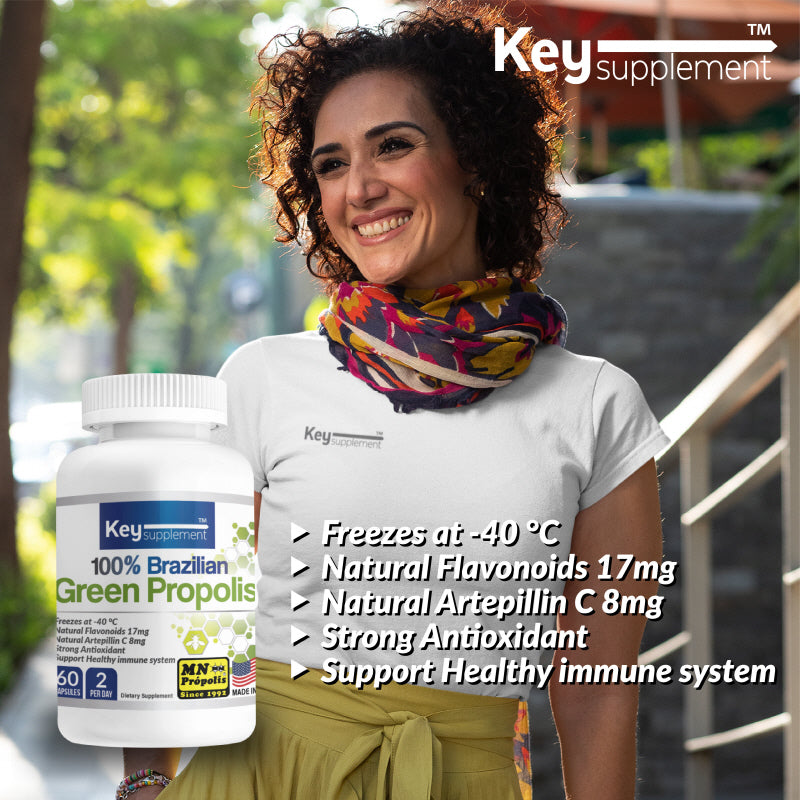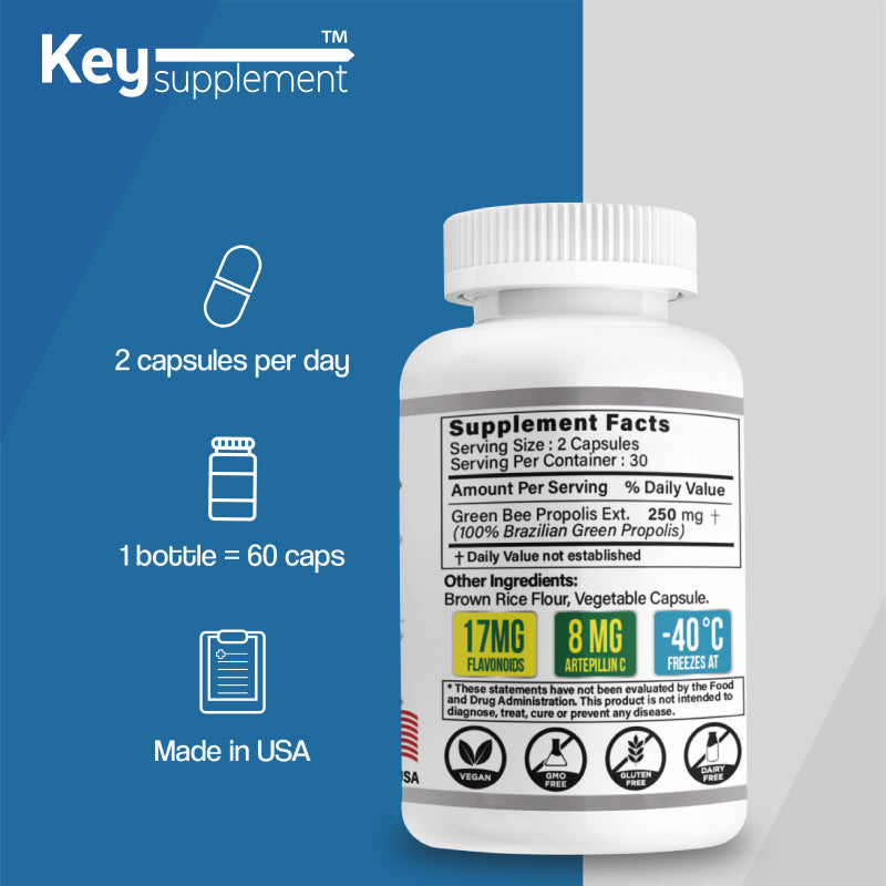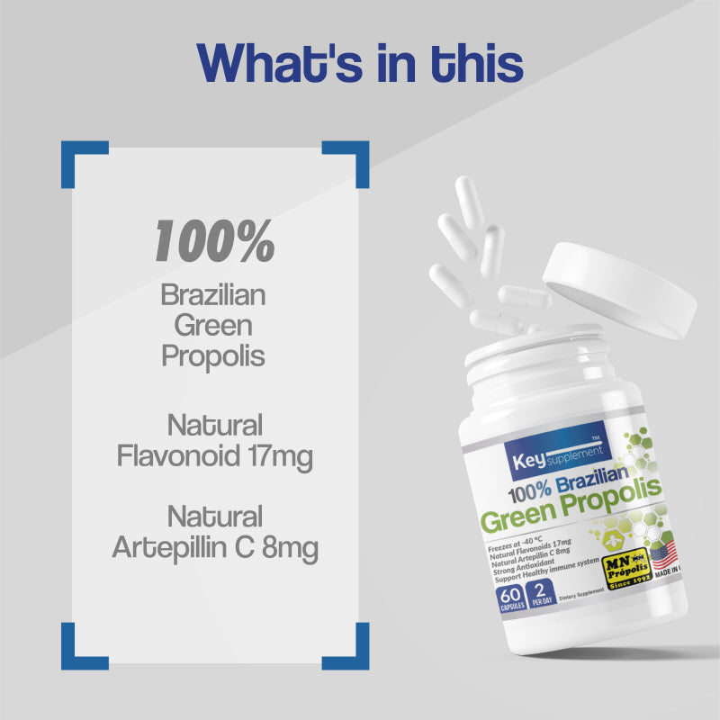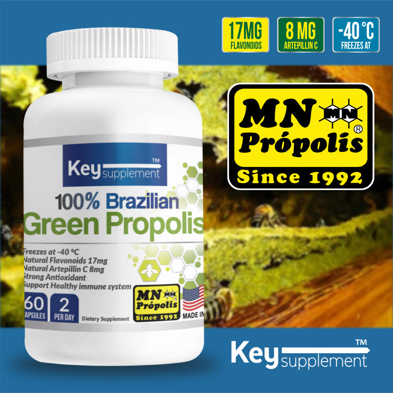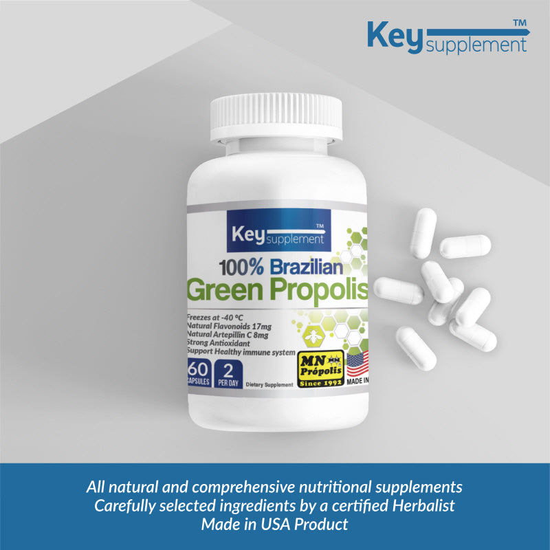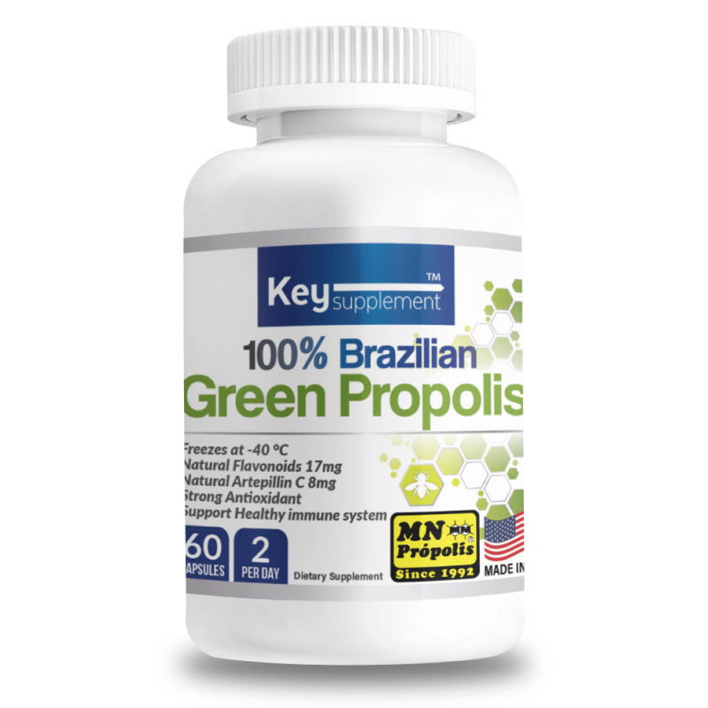 Key Supplements Green Bee Propolis is a high-quality supplement made from 100% Brazilian MN Propolis, specifically designed to offer powerful antioxidant benefits and immune system support. It contains Artepilin-C, a unique active compound known for its strong antimicrobial, anti-inflammatory, and anticancer effects, making it particularly effective in boosting immunity and reducing inflammation. This supplement is perfect for those seeking to naturally enhance their overall health and well-being.