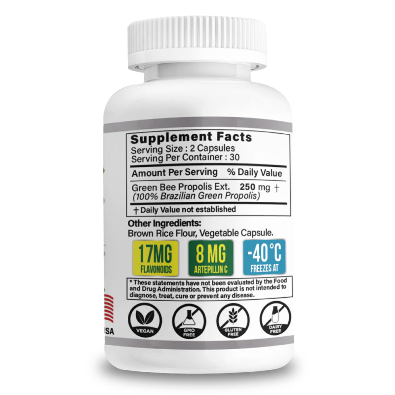 Brazilian Green Propolis contains more flavonoids and phenolic compounds than regular propolis, providing stronger antioxidant effects. These powerful antioxidants help neutralize free radicals, prevent cellular damage, and support overall health, including anti-aging benefits. This product delivers 17mg of flavonoids per serving, ensuring strong protection against oxidative stress.